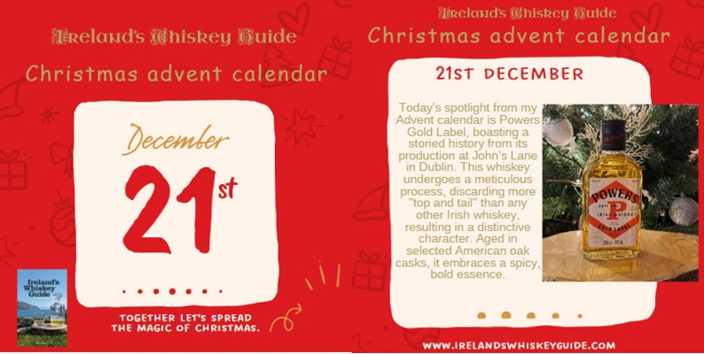 Today's Advent calendar spotlight is Powers Gold Label, steeped in the storied history of John’s Lane, Dublin. This whiskey stands out with more 'top and tail' being discarded in its production than any other Irish whiskey. It matures in carefully selected American oak casks, where its bold, spicy character evolves.