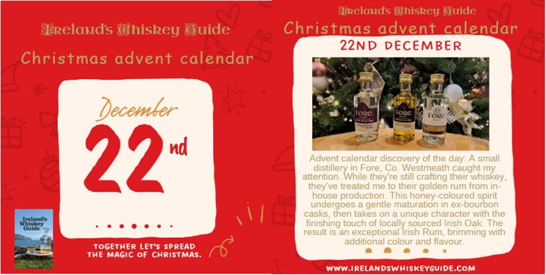 Today's spotlight from my Advent calendar: A discovery from a small distillery in Fore, Co. Westmeath. Although this distillery is new and hasn't debuted its whiskey yet, they've astonished me with their golden rum crafted in-house. This honey-coloured spirit undergoes a serene maturation in ex-bourbon casks, culminating in a finishing touch with the distinctive qualities of locally sourced Irish Oak. The result? An exceptional Irish Rum, rich in both colour and flavour.